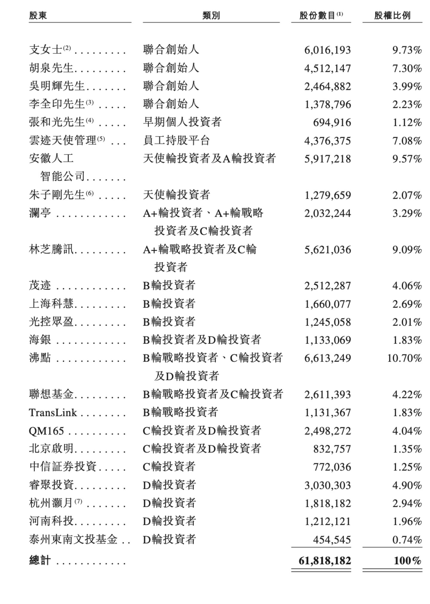 此外,沸点资本持股10.70%,系第一大外部股东;科大讯飞持股12.54%的安徽人工智能公司持股9.57%;林芝腾讯持股9.09%;启明创投旗下QM165持股4.04%,北京启明持股1.35%,合计持股约5.39%;联想基金持股4.22%;阿里旗下杭州灏月持股2.94%;早期个人投资者张和光持股1.12%。