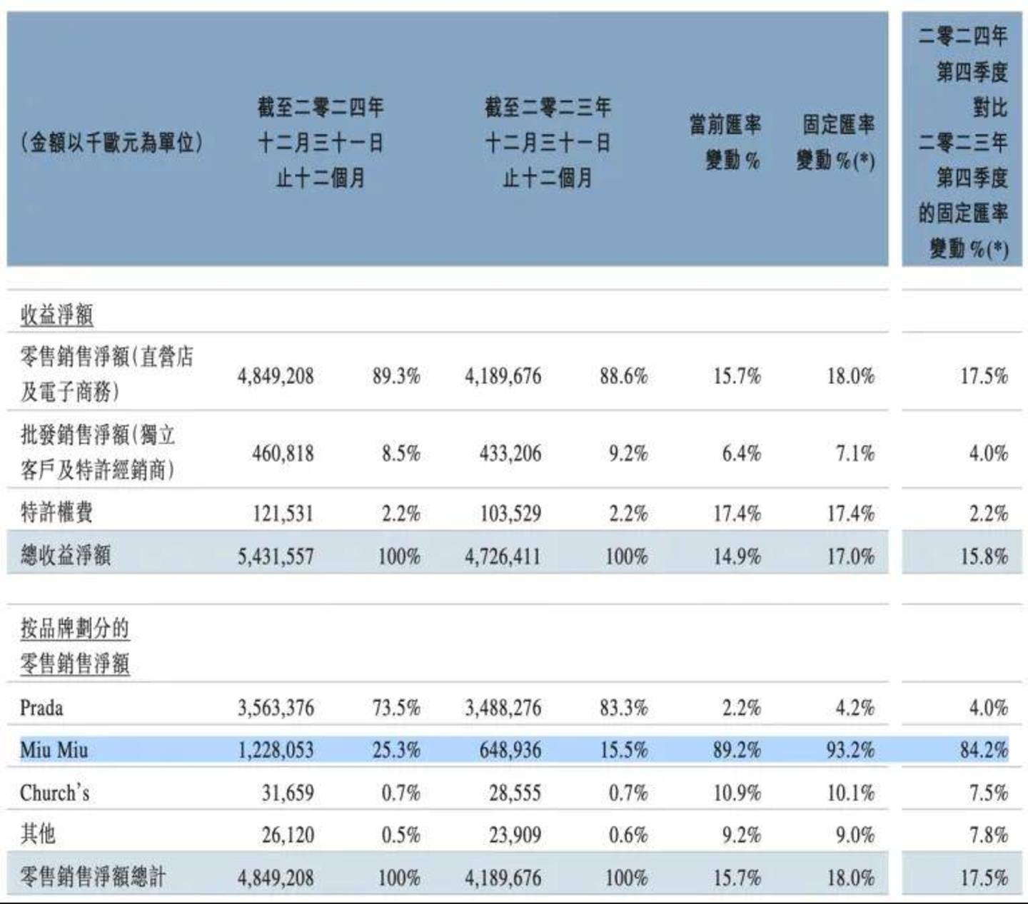 财报显示,2024年,Miu Miu的零售额增加93.2%,创下历史新高。尤其在关键销售旺季的第四季度,Miu Miu上涨84.2%至3.7亿欧元,而主品牌Prada和另一子品牌Church’s也在同期分别上涨4%和7.5%。