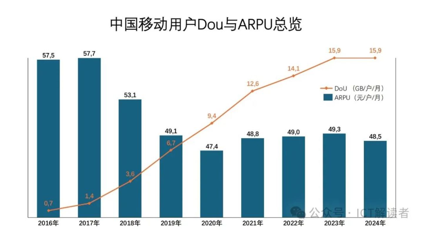 然而,从中国移动2024年的财报数据来看,在新增0.88亿5G网络用户推动5G渗透率提升到55%的高位水平后,其全网平均DoU却停留在15.9GB的水平线上,与2023年相比没有任何增长,非常突兀地终结了中国移动用户DoU此前数年连续保持两位数增速的势头。与此同时,中国移动的用户ARPU值也从2021年以来的缓慢爬升态势转而在2024年变成了掉头向下,同比2023年减少了0.8元。