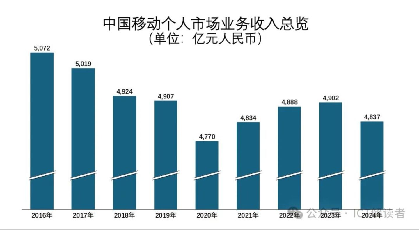 但是,在整体业绩增长的表象下,作为中国移动基本盘的个人市场收入规模却出现了近五年来的首次逆势下滑,暴露出这家通信巨头所面临的深层隐忧:财报数据显示,中国移动2024年个人市场收入为4,837.10亿元,较2023年的4,901.99亿元减少约64.89亿元,成为中国移动唯一负增长的业务板块,同比下降了1.3%。