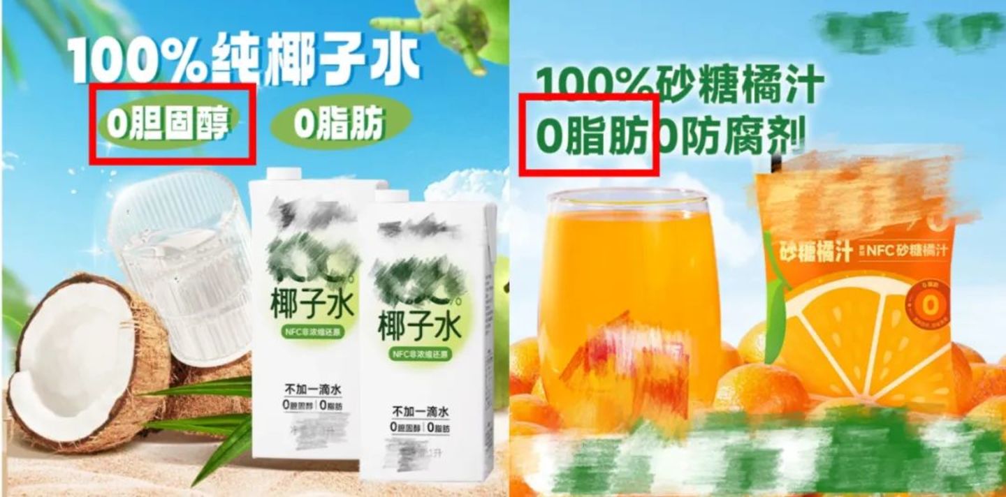 同样的卧龙凤雏,还有标了「0脂肪」的果汁,「0香精」的香菇干,「0胆固醇」的椰子水。
