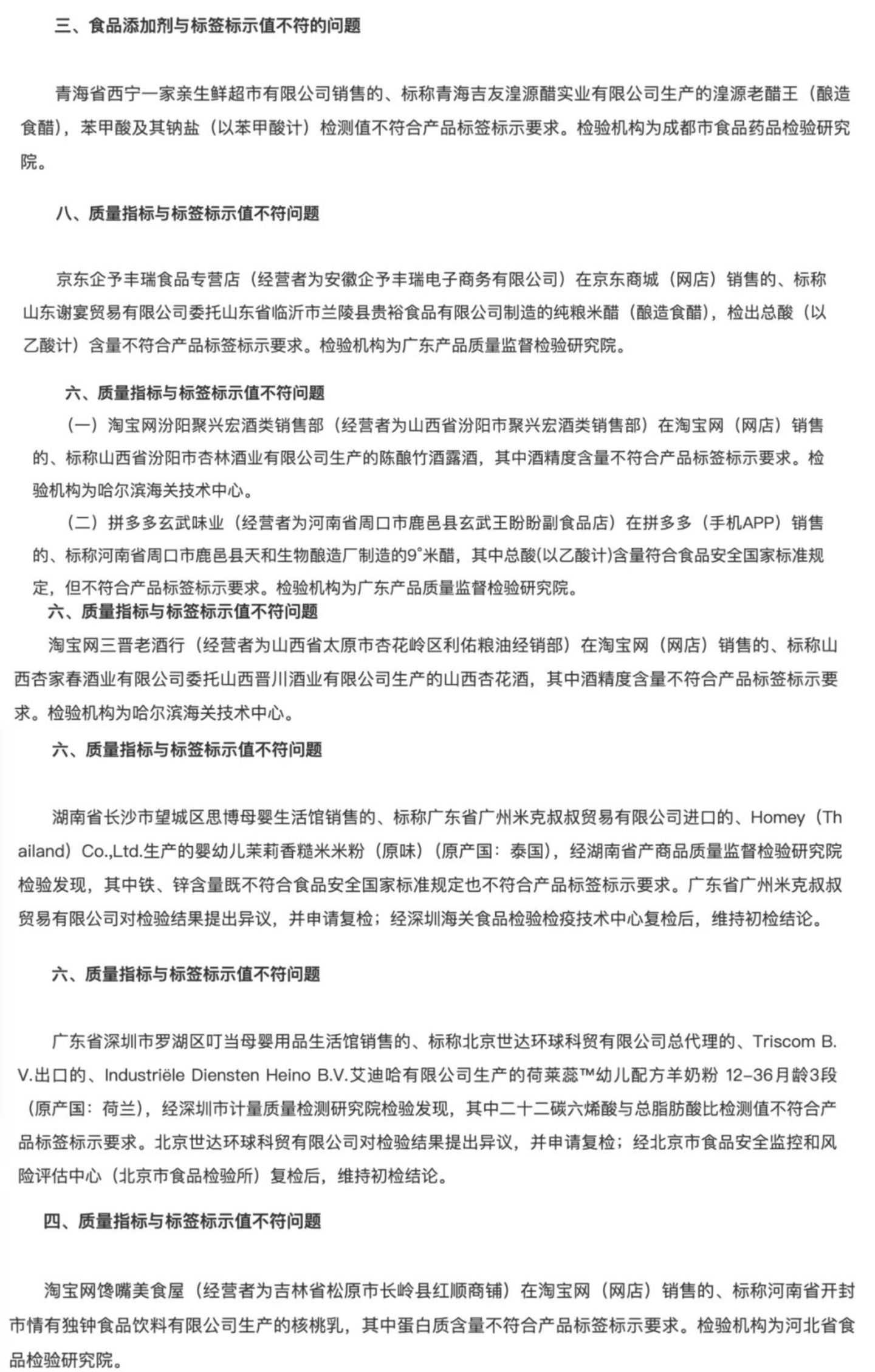 2024年全年至今,「质量指标与标签标示值不符问题」的情况,已有 35 条。在今年最近一次发布的通告中,并且开始单列出「食品添加剂与标签标示值不符问题」的情况。