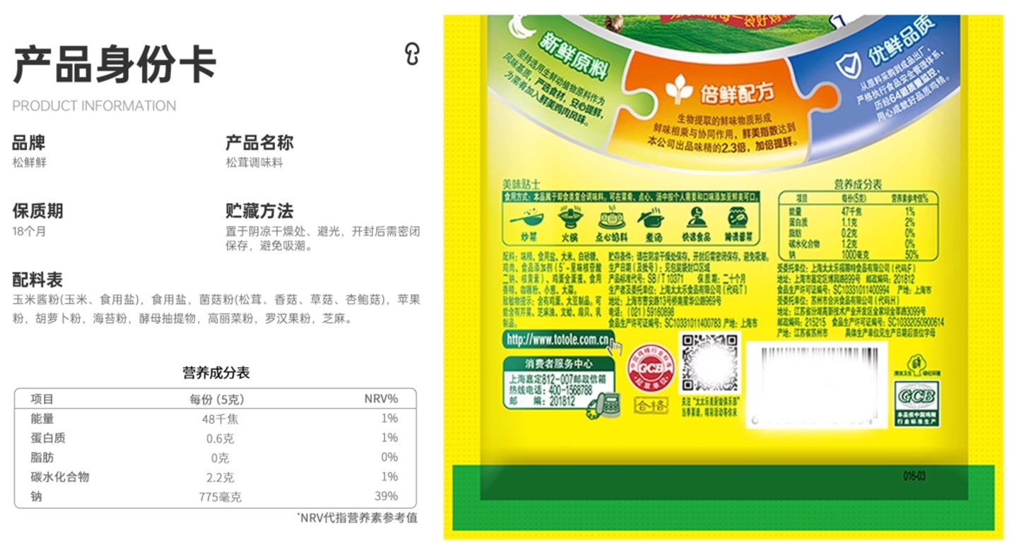相比来说,调味品所能贡献的实际减钠“效果”,还仍需要认真考量:每5g松鲜鲜松茸鲜含钠量(775mg/5g,来自配料表)比太太乐鸡精(1000mg/5g,来自配料表)少了225mg,使用松鲜鲜能够贡献的钠摄入减少比例为22.5%,削减了约四分之一的钠摄入。但一般而言,在家庭烹饪中,每人每天的松茸鲜或鸡精类产品摄入量或许不到5g。如果按照人日均摄入5g来计算,一对夫妻每10天就能吃完一瓶100g的松鲜鲜松茸粉。