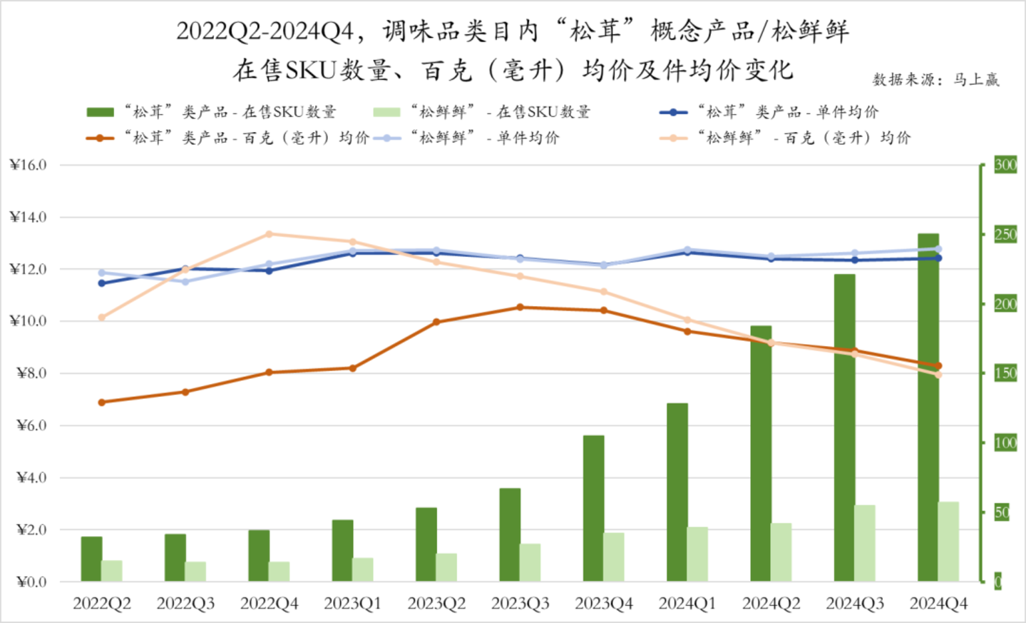 不乐观的是,即便是在其最具代表性的“松茸”概念上,松鲜鲜也正面临着“稀释”。数据显示,2023年后,“松茸”相关产品在整个调味品市场中的SKU数量快速增长,从2023Q2不到100款迅速扩张至2024Q4的近250款,松鲜鲜正面临着更多的同类竞争SKU。