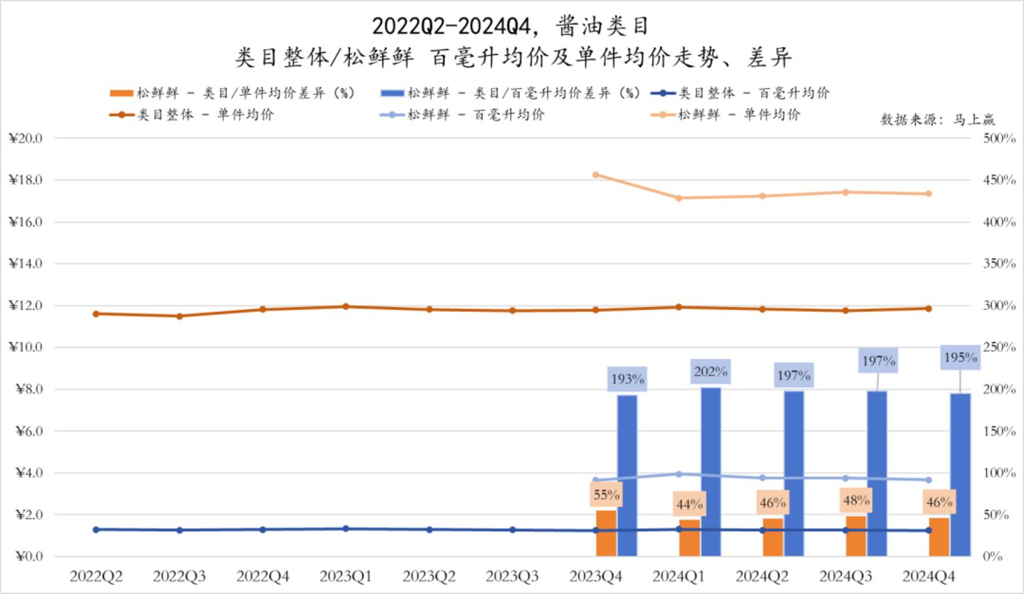 自2023Q4进入酱油赛道以来,松鲜鲜在该品类的定价策略依然延续了“大幅度高于行业平均”的做法,数据显示,在2023Q4到2024Q4期间,酱油类目的整体件均价约为11.5~12元,而松鲜鲜最开始则超过了18元,后期逐步回落至16.5元上下,但依然高于行业平均水平约40%。