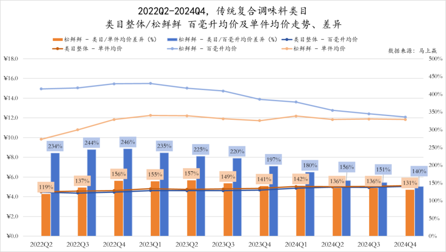 更值得关注的是类型产品定价权与关系上的变化。从件均价来看,2022Q2至2024Q4期间,松鲜鲜在多数季度中略高于“松茸”概念产品的整体件均价,但松鲜鲜的百克(毫升)均价却大幅度超过“松茸”类型产品的平均水平。随着时间的推移与竞争的加剧,在2024Q2,松鲜鲜的百克(毫升)均价则跌破了类型产品平均水平,2024Q4甚至还出现了“件均价较高、单位价格却更低”的倒挂状态,意味着在消费者视角中,松鲜鲜的“高价形象”背后,其实际单位使用成本反而低于其他竞品。