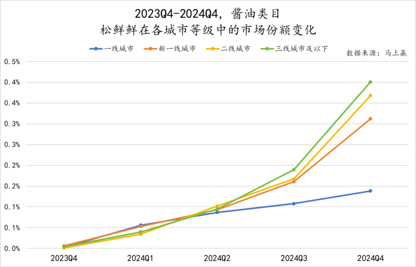在松鲜鲜起家的传统复合调味料类目中,松鲜鲜在各城市等级中在类目中的市场份额,从2023Q1-2024Q4均呈现较明显的涨势,除了2024Q3-2024Q4期间的一线城市等级市场。