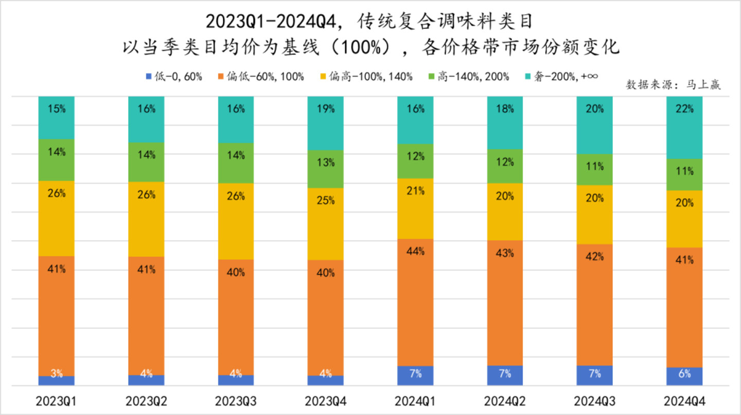 从传统复合调味料类目的情况来看,定价偏高的产品与高的产品两个区间(均价100%-200%)受到的挤压比较严重,相比来说,低(均价0%-60%)定价的产品与奢侈(均价200%+)定价的产品市场份额则均有提升,类目价格带分布出现了一定程度的两极化。