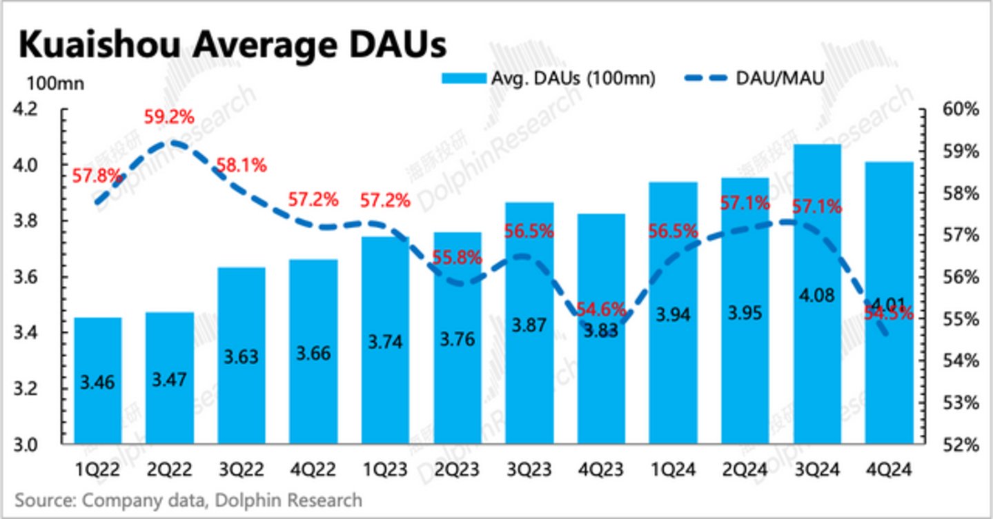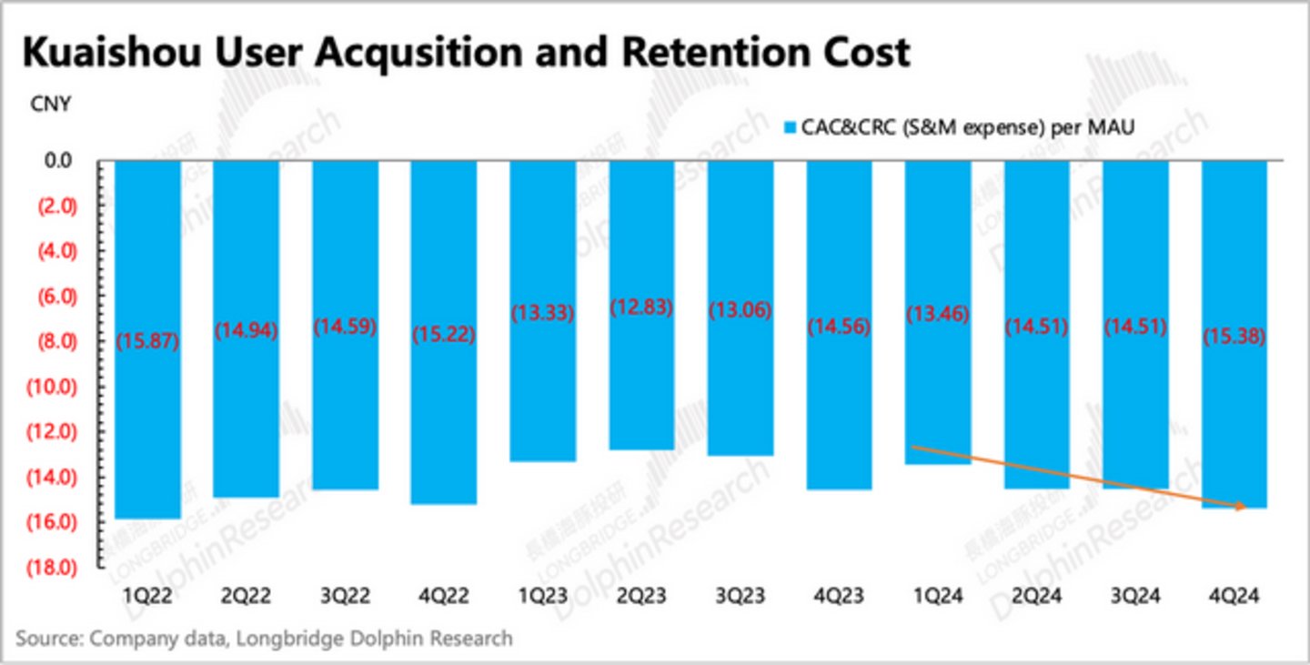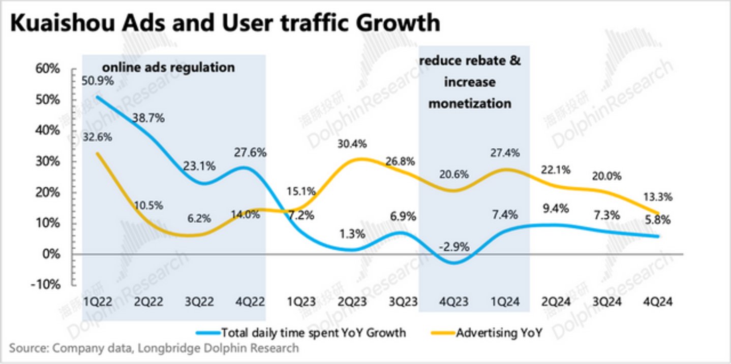 四季度快手总用户单日时长流量增速继续增长5.6%,源于DAU流量同比增长以及日均时长的提升来给到一些支撑。但四季度eCPM的高个位数提升才是外循环广告增长的主力,这里或许有全站投流工具以及UAX对广告ROI提升的帮助。