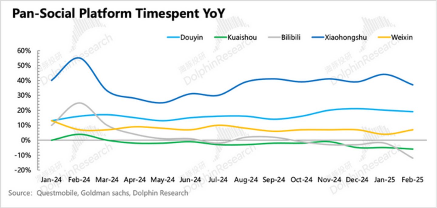 但QM数据来看,快手的用户指标要明显弱于抖音、视频号、小红书,侧面说明竞争分流的影响还是不小的。不过市场如果主要以外部数据作为参考的话,快手的实际表现可以算是一个小惊喜。