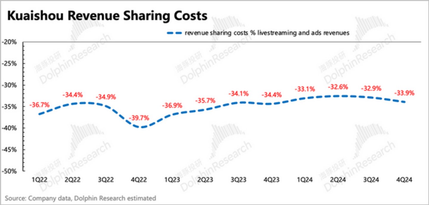 从海豚君拆分的成本细项来看,四季度直播分成成本比例有一些提高,这里可能体现了更多分成较高的优质公会(尤其是游戏主播)引入后,拉高了整体直播的分成比例。四季度,快手签约公会的机构数量同比增长了30%,签约主播数量同比增长超60%。