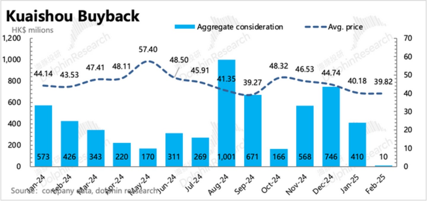 截至四季度末,快手账面有现金+存款=243亿,如果加上短期投资的金融资产,合计515亿,扣掉长期借款之后的净现金有404亿。目前主业经营上早已盈利和现金流转正并不太会耗用太多现金,现金流已经没有压力。因此,如果想要增加回购力度,除了美元现金的换汇问题,主观意愿上应该没有阻碍。