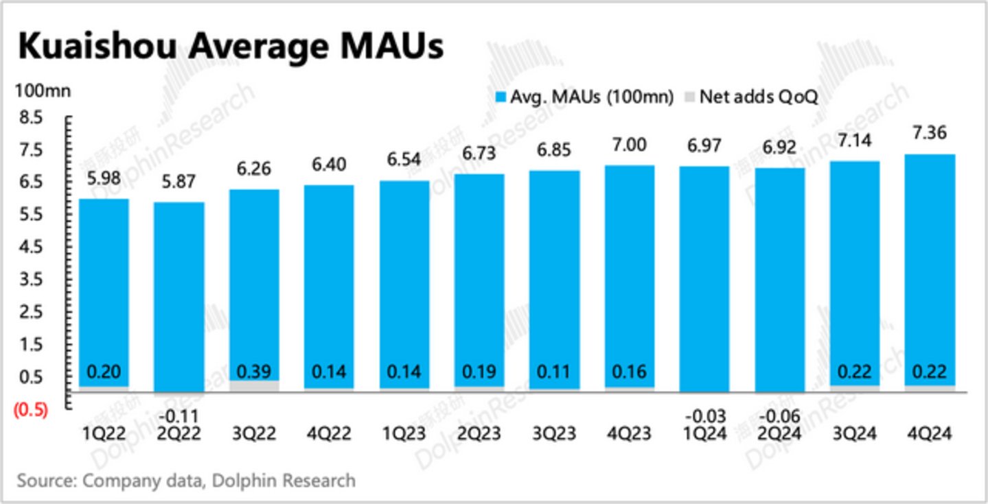 四季度快手月活7.36亿,继续环比增加了2200万人,优于市场预期。市场的预期一般是结合公司的指引和第三方数据平台跟踪的趋势来综合判断。但快手的表现相比于第三方平台显示的趋势(持平及缓慢下滑),要好的多。