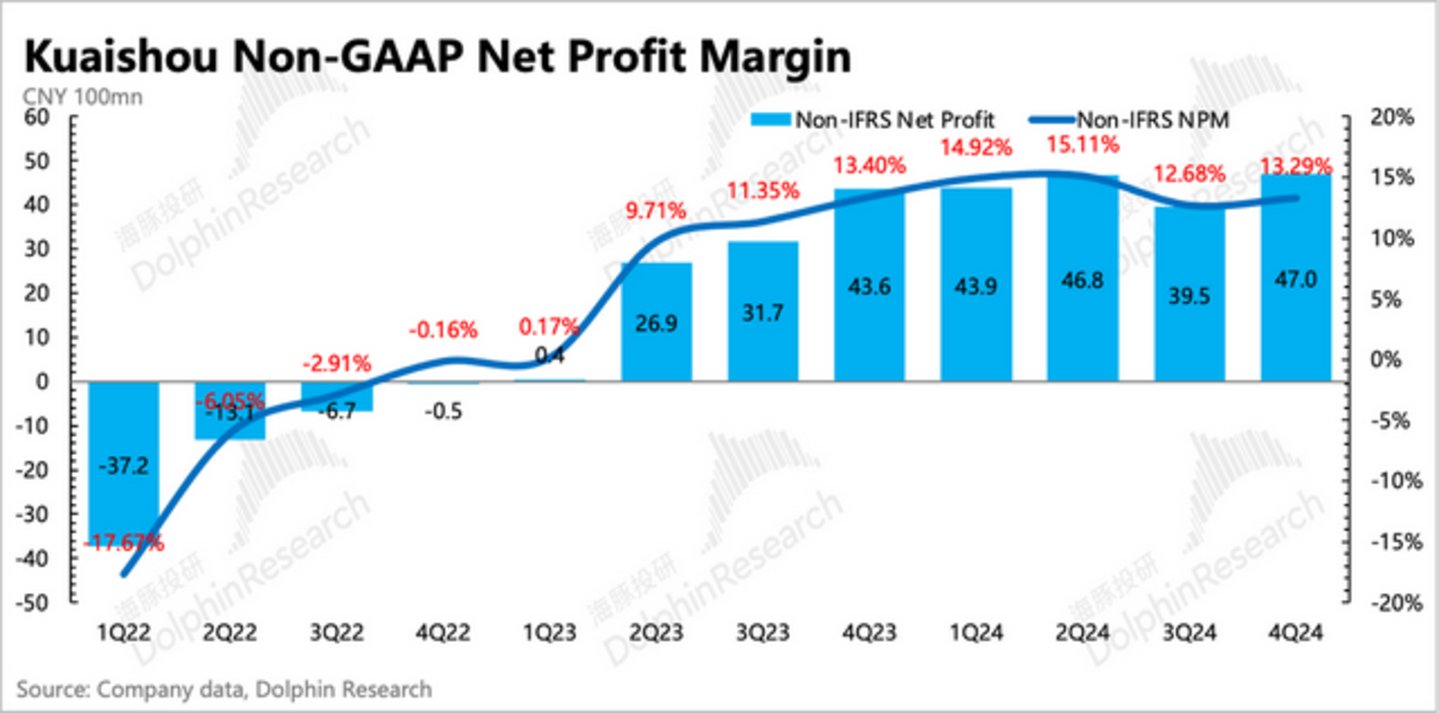 四季度快手实现GAAP下净利润39.7亿,跟随电商旺季环比增加。加回SBC、投资损益调整后的Non-GAAP下净利润为47亿,符合市场预期。