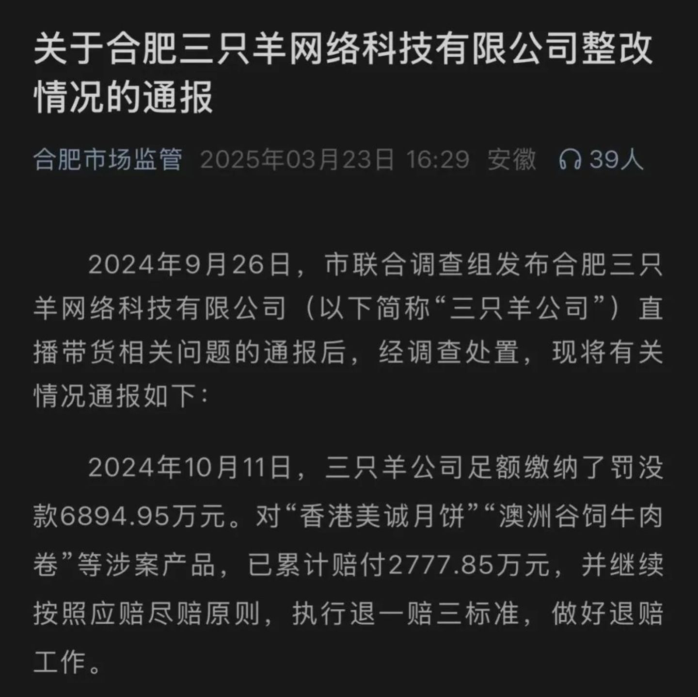 3月23日,合肥市联合调查组发布通告,合肥三只羊网络科技有限公司(下称“三只羊”)整改符合要求,具备恢复经营条件。当天,三只羊发布公告向公众致歉,并表示今后将在选品、品控、内容审查、售后服务等方面做出改进。