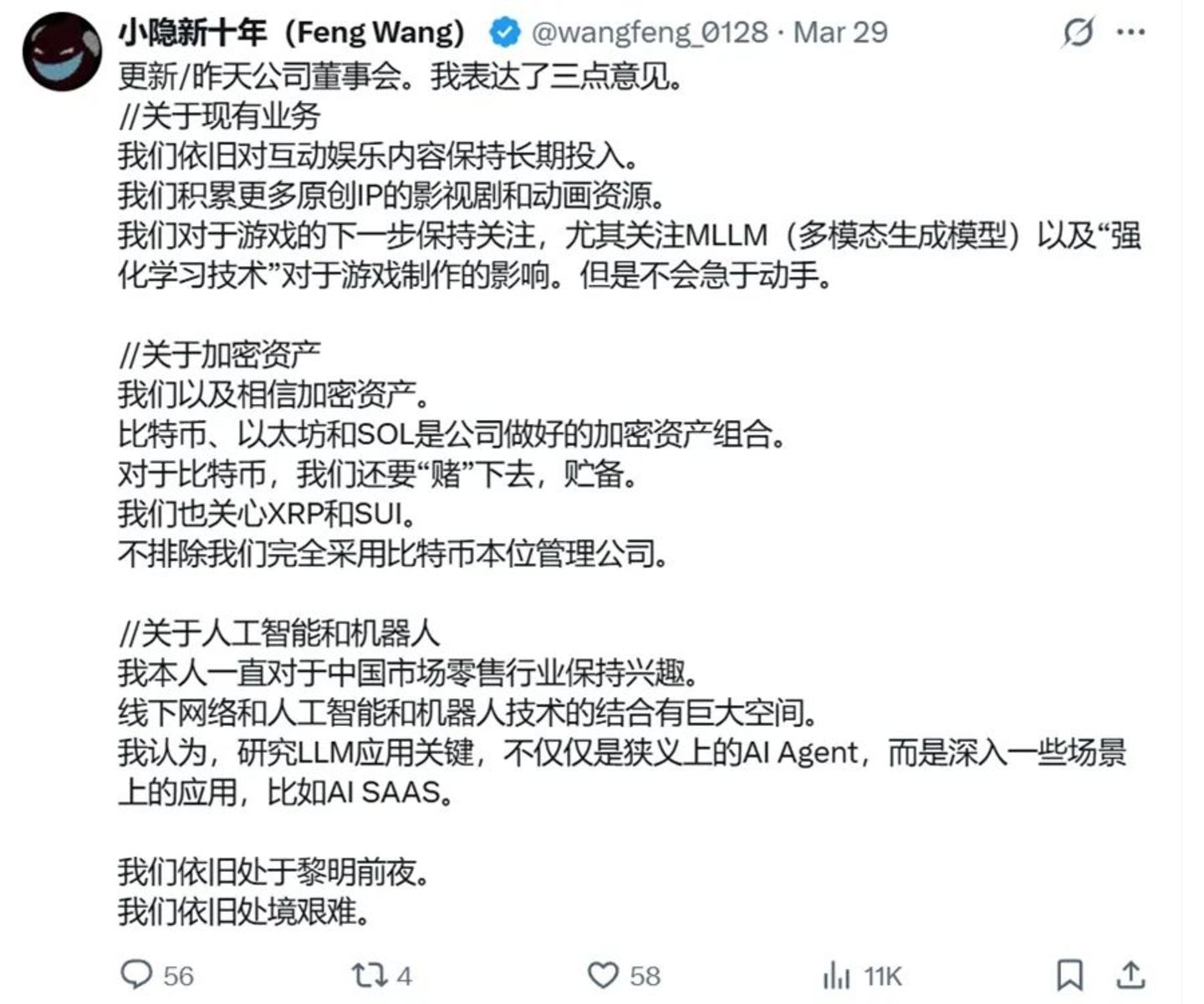 翻看蓝港的2024年报,如今Web 3业务评述已放在所有业务的最前面,也是着墨最多的部分,充分体现了Web 3业务的优先级。董事会审议年报时,王峰对于游戏的态度是保持关注但“不会急于动手”;对于加密资产,他则大胆地表示不排除完全以比特币本位管理公司。