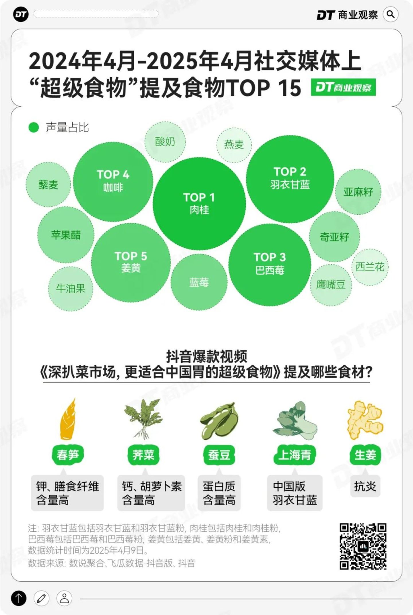 今年3月,一则超级食物相关的抖音爆款视频,还把春笋、荠菜、蚕豆、上海青、生姜定义为5种可以在菜市场里买到的超级食物。