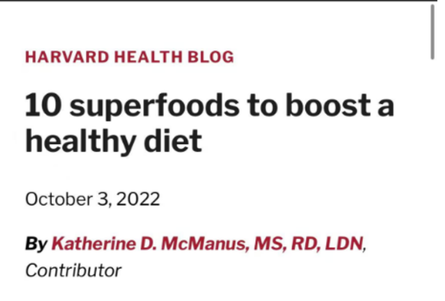 2022年10月,哈佛健康出版网站上发表了一篇标题为《10 superfoods to boost a healthy diet》(《10种超级食物促进健康饮食》)的文章。