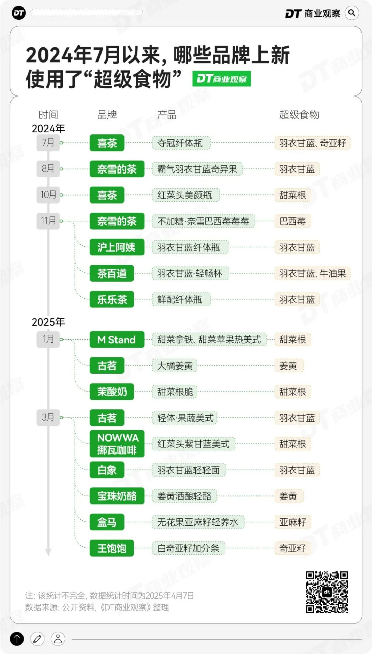 到了2024年下半年,从喜茶的纤体瓶系列开始,持续到现在的超级食物上新热潮,则把超级食物的概念和食用场景,推向了更广泛的人群。