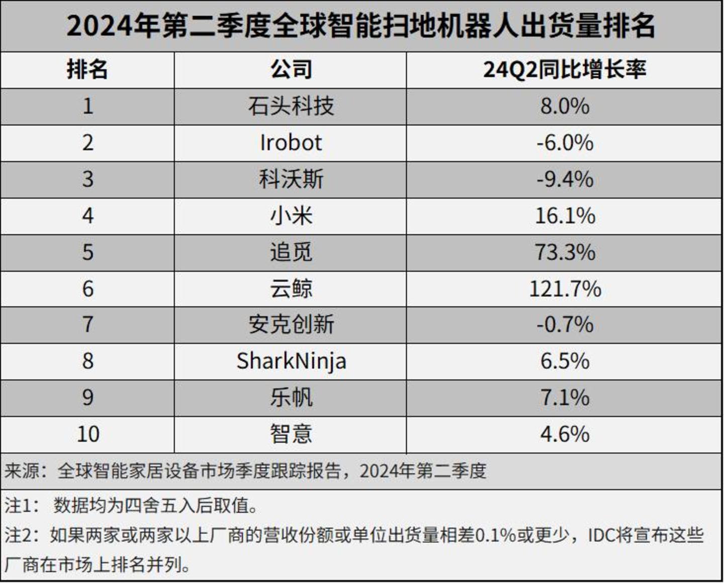 IDC的数据显示,2024年第二季度,全球智能扫地机器人出货量前十位的企业中,中国公司或中资控股公司就占了九家。