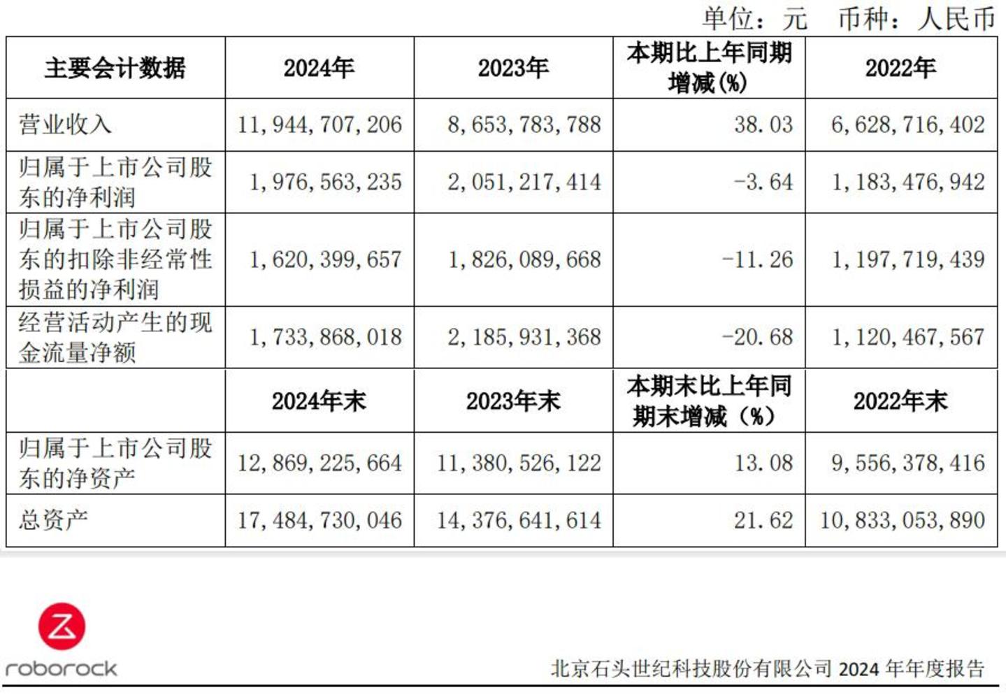 近日,石头科技披露了2024年的财务报告,财报显示,全年实现营收119.4亿,同比增长38.03%;实现净利润19.77亿,同比下滑3.64%。