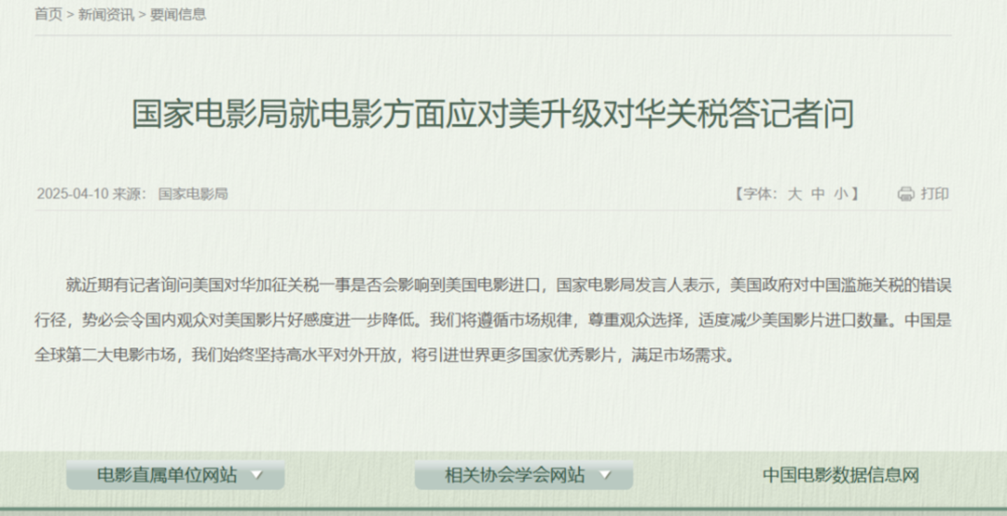 4月10日晚间,国家电影局官方网站发布了一则名为《国家电影局就电影方面应对美升级对华关税答记者问》的消息:“美国政府对中国滥施关税的错误行径,势必会令国内观众对美国影片好感度进一步降低。我们将遵循市场规律,尊重观众选择,适度减少美国影片进口数量。” 并表示会增加更多国家优秀影片的引进。