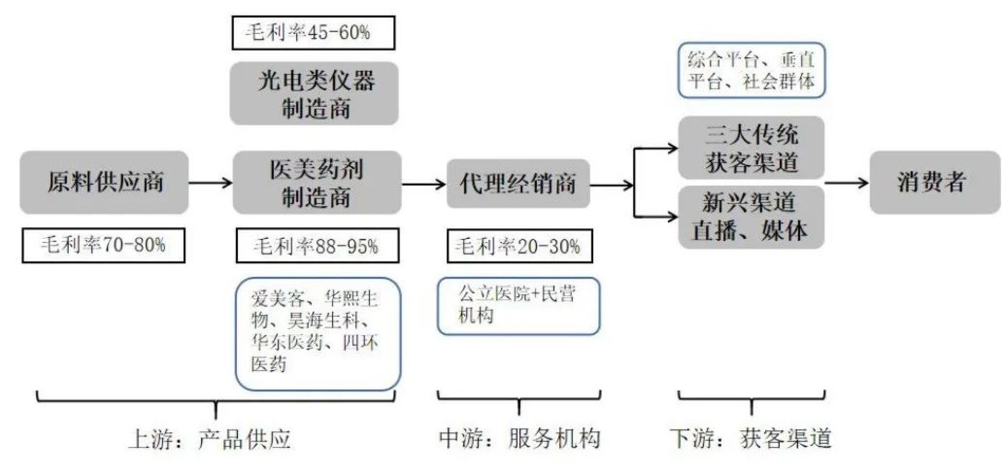 (2)流通端:产业中游是流通端,主要是经销商和医美机构。