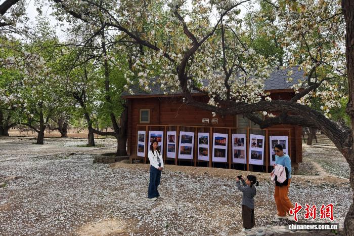 4月10日,宁夏中卫市南长滩村百年梨园,游客拍照打卡欣赏美景。 中新网记者 李佩珊 摄