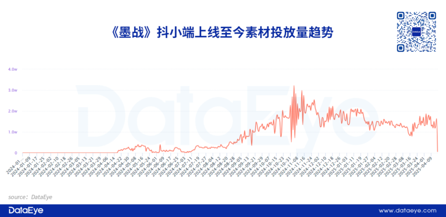 事实上,《墨战》抖音小游戏整体投放力度就比较大。自去年4月以来持续保持了活跃的素材投放量。DataEye-ADX投放数据显示,《墨战》抖音小游戏单日投放素材量峰值达3.2万条。进入2025年仍保持了不俗的投放量,日均超过1万条,但素材主要为达人视频素材。