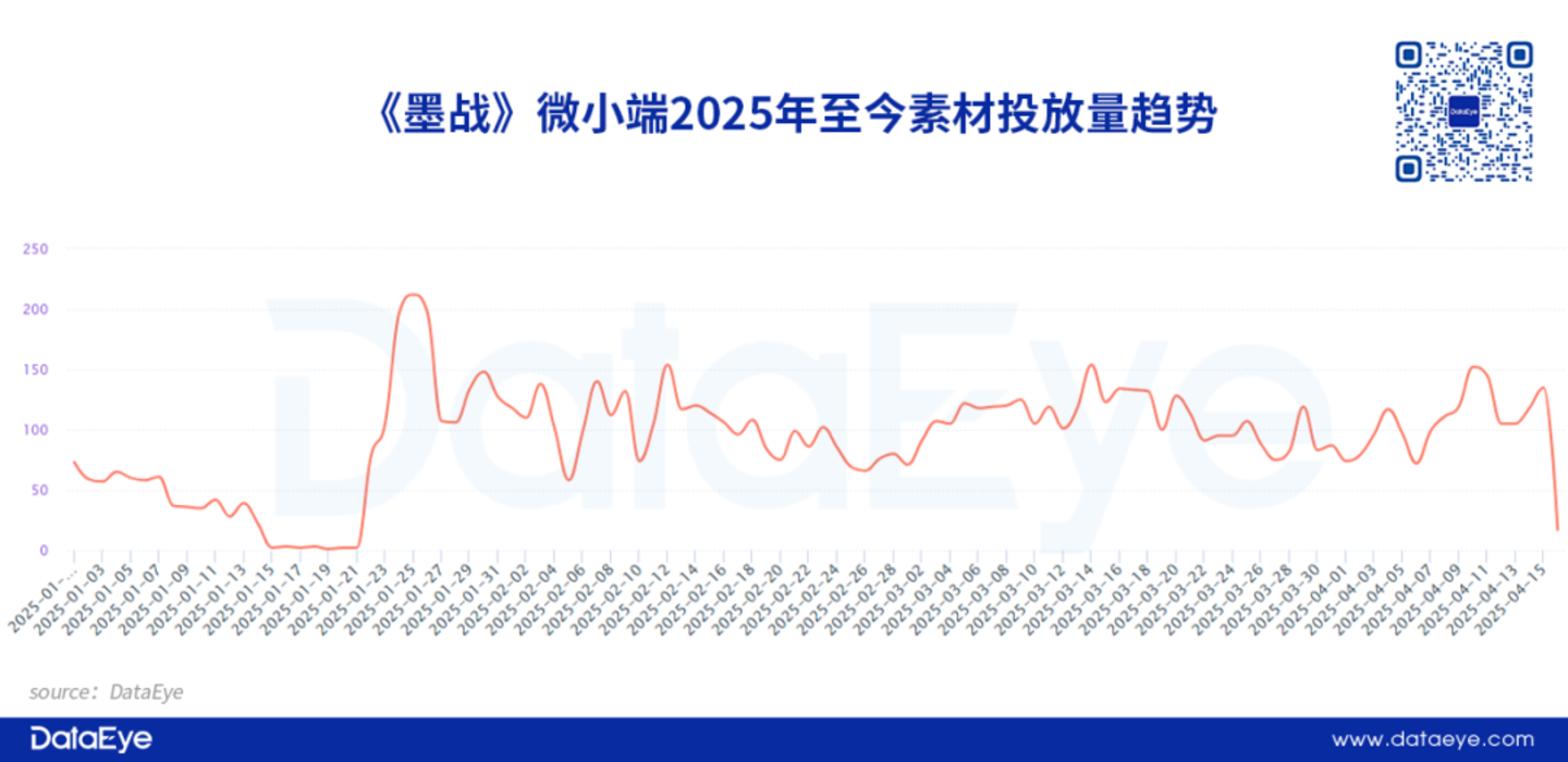进入2025年,《墨战》微信小游戏持续保持了素材投放量,但投放趋势比较平稳,单日投放素材量峰值约200条。整体素材投放力度并不算特别大。