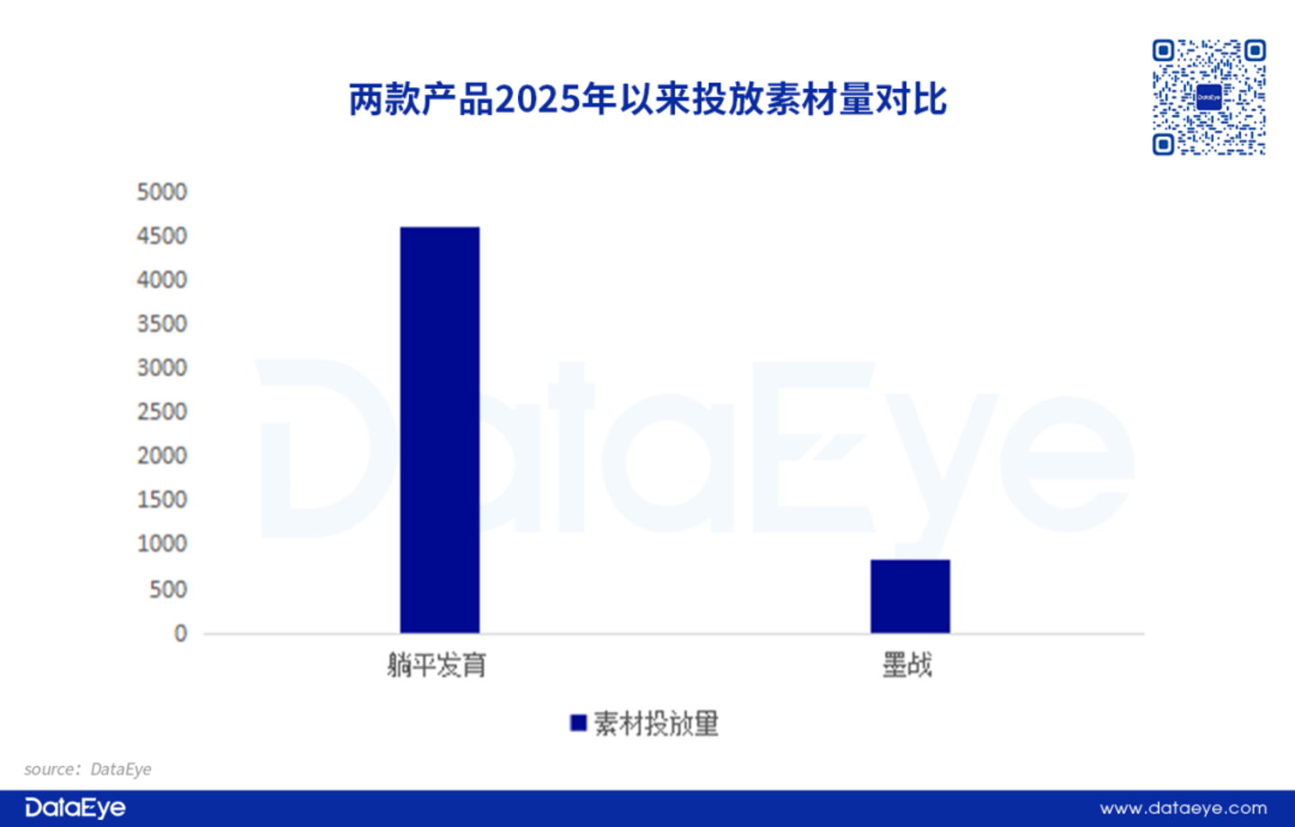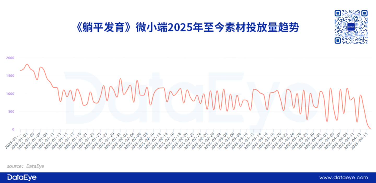对比来看,《躺平发育》微信小游戏端的素材投放量相对强势。2025年以来投放素材量超过4600条,是《墨战》830条的5倍多。可是素材投放量趋势来看,《躺平发育》微信小游戏端在今年呈现持续下滑的态势。