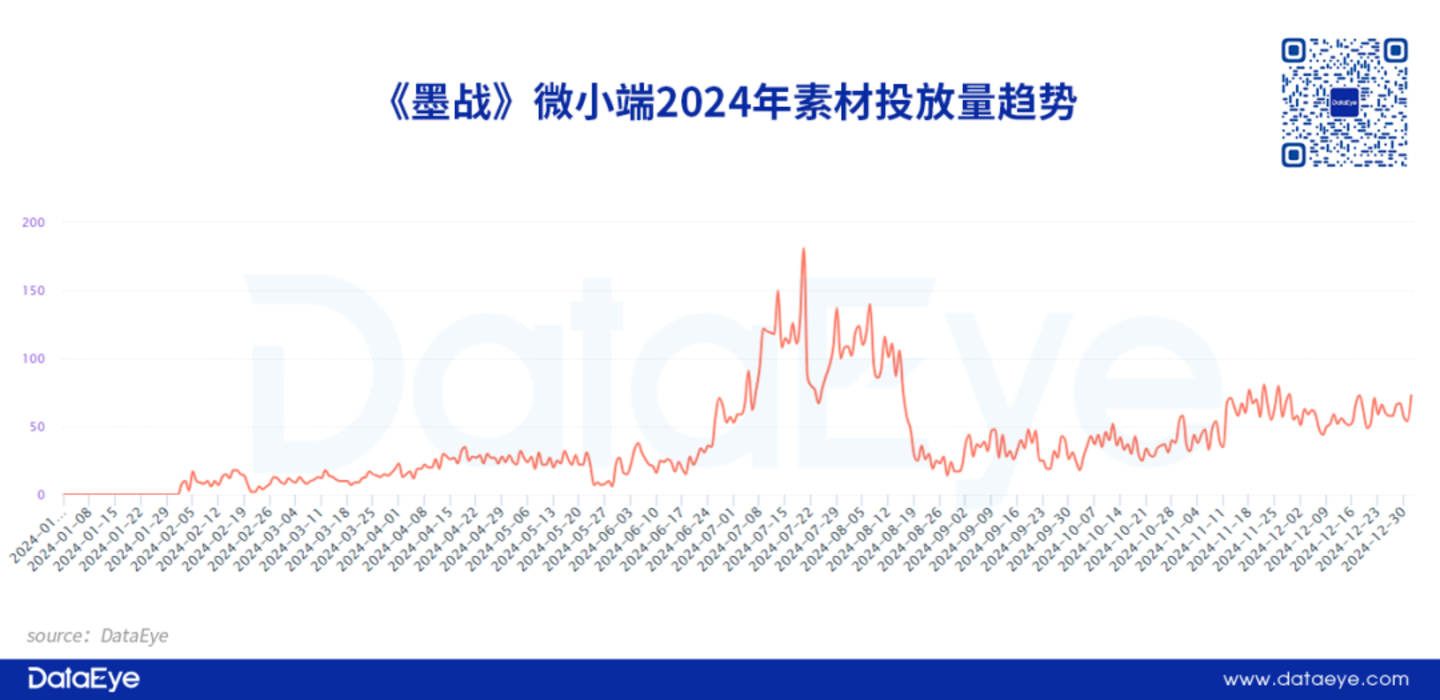 DataEye研究院观察发现,项目组对于《墨战》在微信小游戏端的买量营销有两个特点: