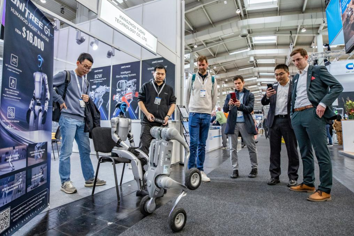 2025德国汉诺威工业博览会,当今规模最大的国际工业盛会上,一只四足机器狗在人群中穿梭,时不时停下来观察路况,躲避人群。在它的周边,不少观众举起手机拍照记录,还有很多参展商和观众凑在展台前跟工作人员攀谈。