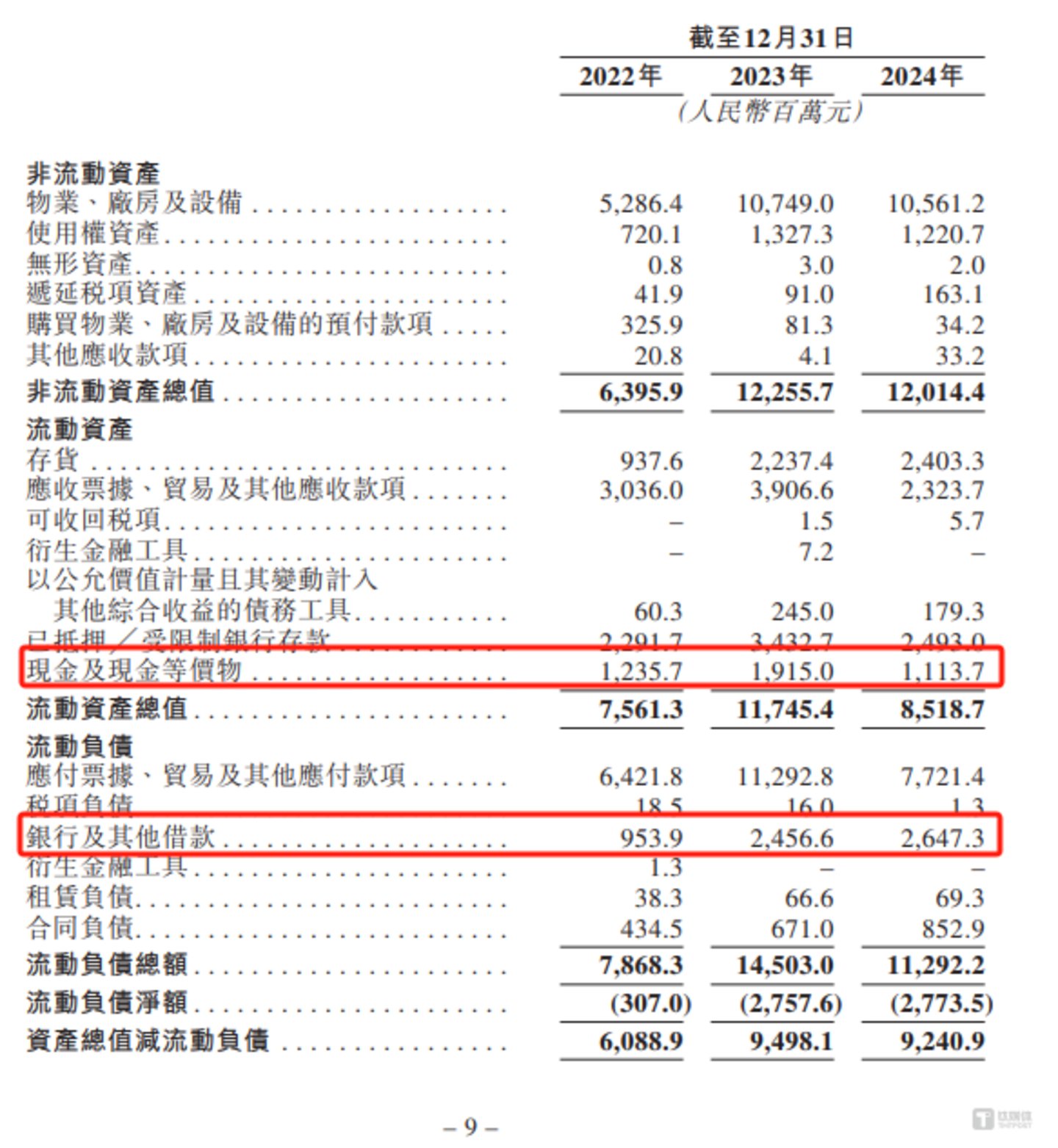 与此同时,在上述时间段内,中润光能的现金及现金等价物分别为12.36亿元、19.15亿元、11.14亿元,流动负债中的银行及其借款分别为9.54亿元、24.57亿元、26.47亿元,自2023年公司的现金及现金等价物就已经不够支付银行及其借款。