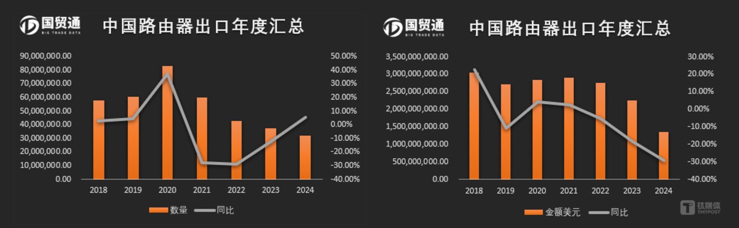 根据国贸通统计的数据显示,2018年路由器出口平均单价约为52.72美元/台,2022年平均单价为64.74美元/台,为历年最高,而到了2024年,平均单价降至42.09美元/台,出口价格的降低也一定程度上说海外市场竞争加剧。与此同时,2020年国内路由器出口达到顶点后,已经连续4年下滑,也一定程度上说明海外市场需求放缓。
