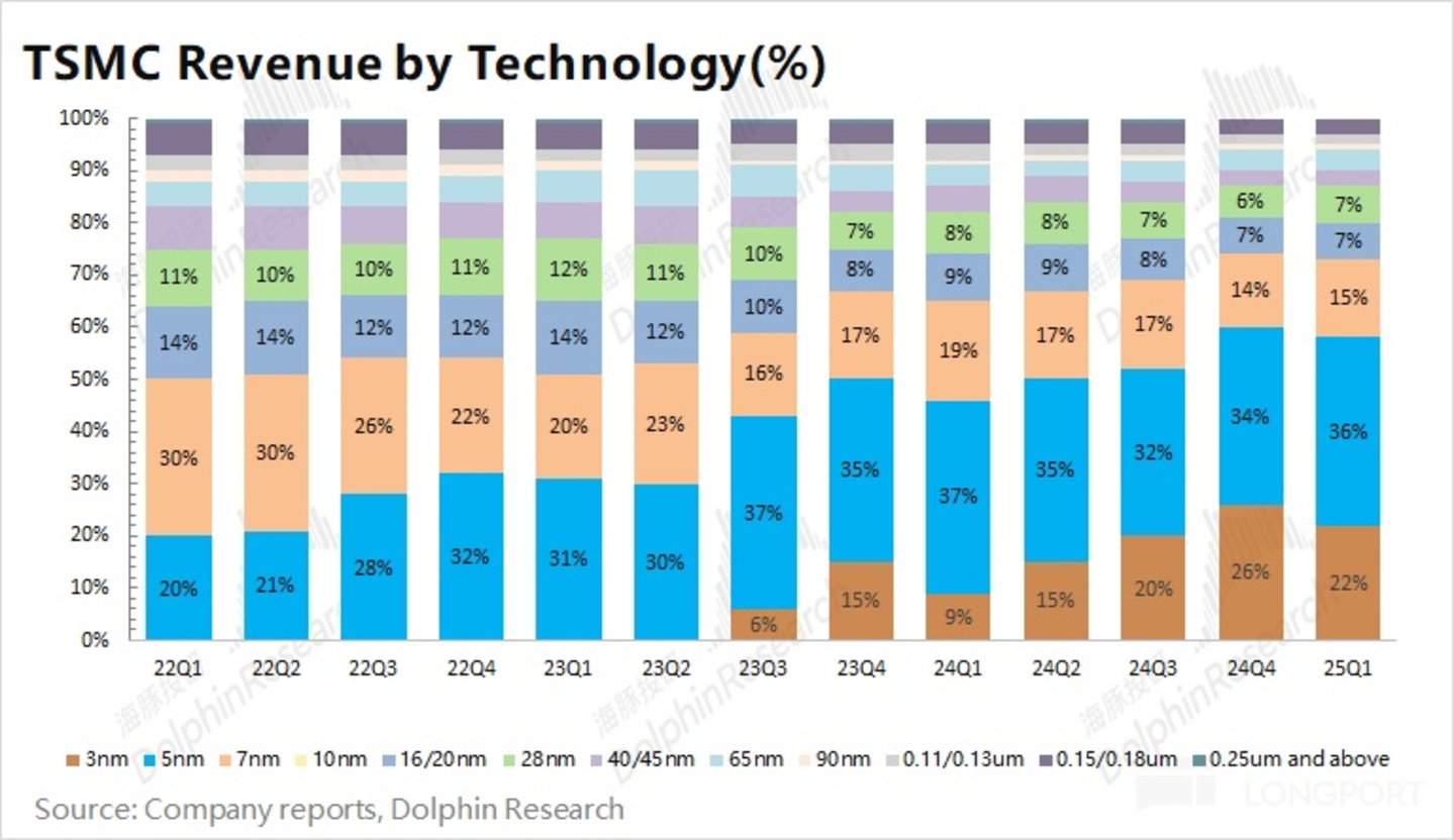 本季度 7nm 以下的收入占比维持在 73%,先进制程领域的收入已经是公司的核心来源。具体来看,本季度公司 3nm 收入占比为 22%,而 5nm 的收入占比进一步提升至 36%。