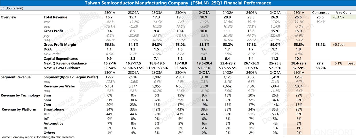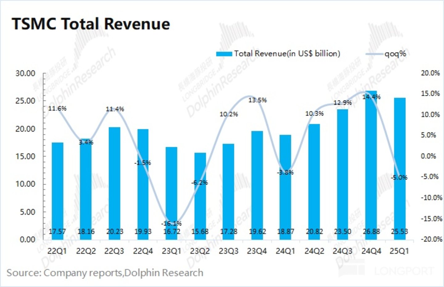 台积电在 2025 年第一季度实现营收 255.3 亿美元,符合指引(250-258 亿美元)。本季度收入环比下滑 5%,一季度是传统淡季,受智能手机业务季节性回落的影响。