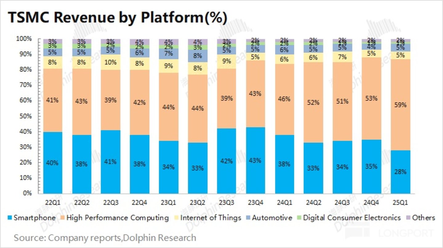 智能手机和 HPC 是台积电最大的收入来源,两者合计占比达到 87%,是公司下游收入的最大来源。