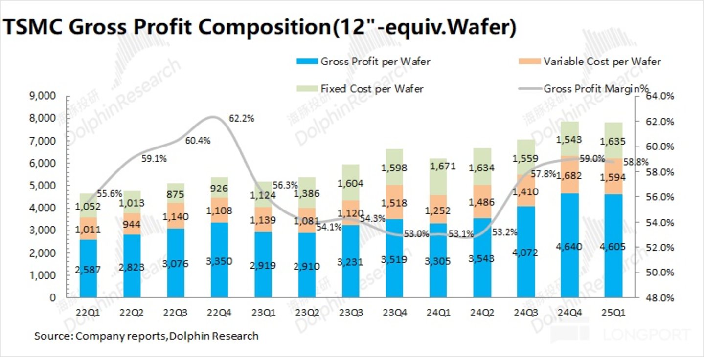3)可变成本(其他制造费用):2025Q1 台积电平均可变成本约 1594 美元/片,环比下降 88 美元/片。随着先进制程产能进入 “饱满” 状态,公司单位可变成本也有所回落。