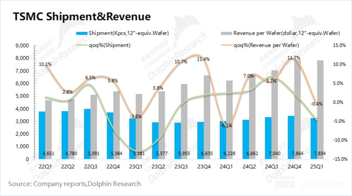 1)单片晶圆收入(等效 12 寸):2025Q1 台积电单晶圆收入约 7834 美元/片,环比下降 31 美元/片。虽然本季度单晶圆收入有所回落,但在部分产品涨价和先进制程的带动下,仍在相对高位;
