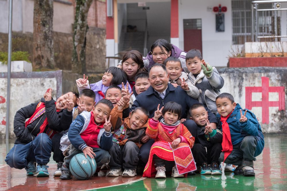 农加贵和学生们在落松地小学操场上合影。新华社记者 彭奕凯 摄